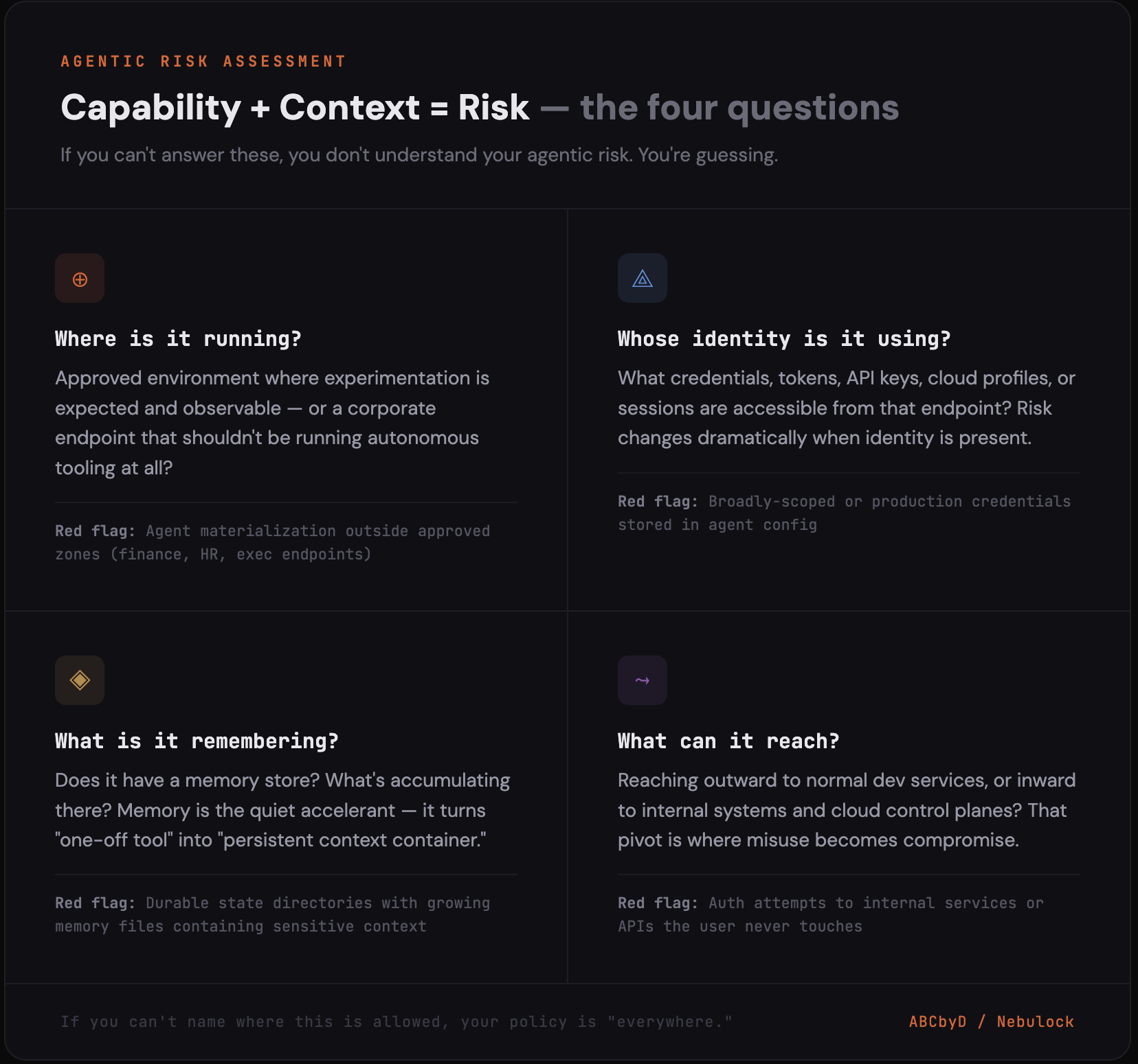 If you can’t answer those four questions, you don’t understand your agentic risk, you’re guessing…and if you can’t name where this is allowed, your policy is effectively “everywhere,” and that’s not a policy.