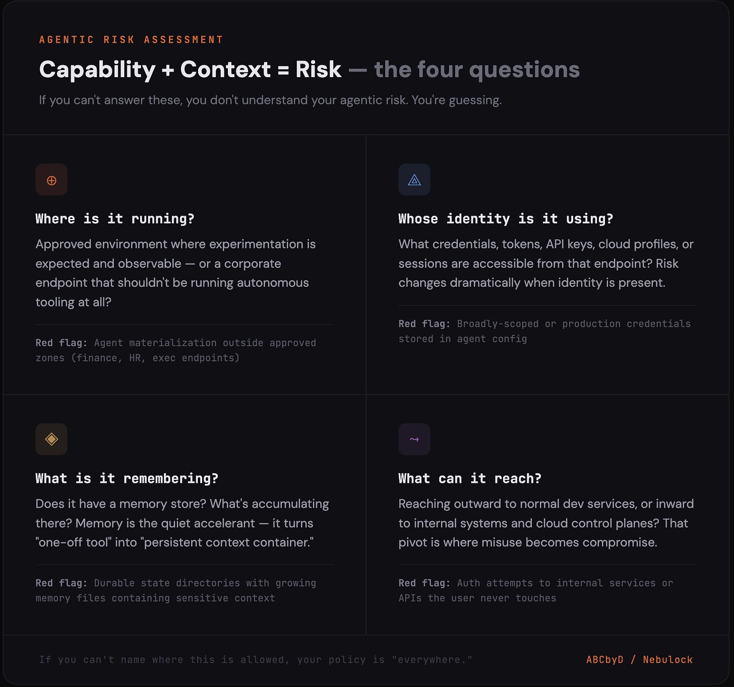 Why this convicts: The risk shift happens when the endpoint becomes a credential container for an autonomous system. That’s when “tool” becomes “capability.”
